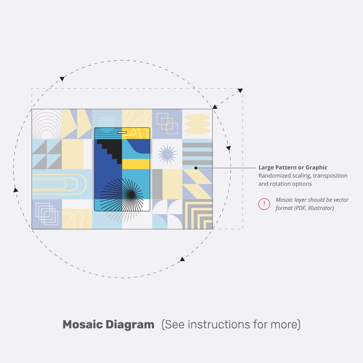 Mosaic artwork should be in vector format (PDF, Illustrator). Larger images and patterns work best for variation. We recommend artwork dimensions are a minimum 200% of the final print area. Scaling, positioning, and rotation are each optional and can be combined depending on desired output.